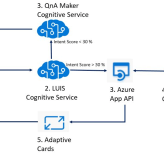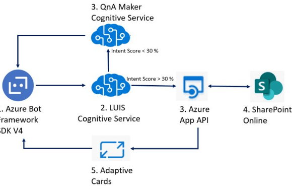 Le SDK V4 du Framework Bot Azure est utilisé pour développer des bots, avec LUIS qui interprète l'intention de l'utilisateur et QnA Maker qui fournit des réponses basées sur les données. SharePoint Online sert de base de données de contenu, tandis que les Cartes Adaptatives créent des dialogues interactifs. Ensemble, ils forment un système intégré pour des interactions de bot sophistiquées sur Azure. Est-ce que c'est génial ?